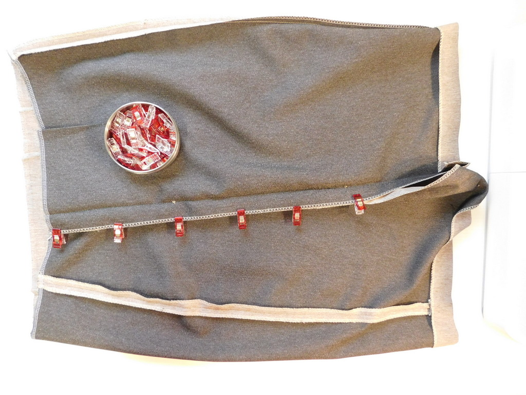 Jetzt befestige den Saum am unterem Ende der Jacke mit Stecknadeln.